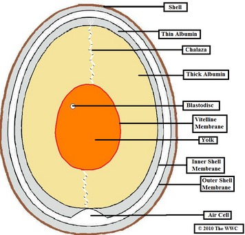 We discourage you disturbing the nests and this guide uses images from a generous member of the public which specialises in making hand crafted replica bird eggs. To buy some of the eggs or take a look at the range please click here. Egg Anatomy [] This diagram shows the anatomy of a freshly fertilised chicken egg.