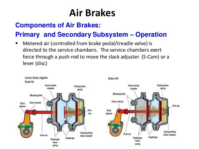 Charging: The system must be pressurized with air before the brakes will release.At rest, the brakes remain engaged. Once the system reaches its operating pressure, the brakes are freed and ready to use. Applying: As the brakes are applied, air pressure decreases.As the amount of air decreases, the valve allows air back into the reservoir tanks, while the brakes move to the applied position.