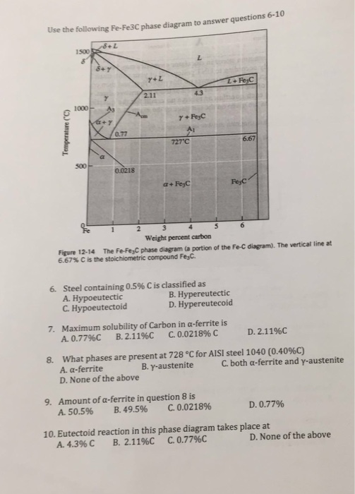 The Fe-C phase diagram provides temperature-composition map of where the two phases (austenite and ferrite) occur. It also indicates where mixtures of these two phases can be expected. The Fe- C phase diagram is shown in Fig 2. In pure iron, austenite transforms to ferrite on cooling to 912 deg C. Fe-Fe 3C phase diagram is given on the last page of the exam. _____ Multiple choices (2.5 points each): ____ 1. A phase is defined as a matter with A. distinct composition B ... But the pearlite is composed of Fe3C(carbide) and Ferrite , So at the end, the whole structure is composed of Ferrite and Fe3C(carbide).