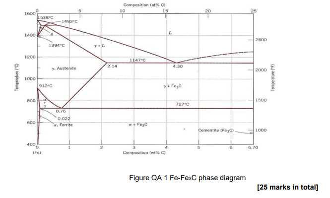 Fe-Fe3C phase diagram. 5. Estimate %Cm in Ledeburite just below eutectic and just above eutectoid temeratures. What is its structure at room temperature? 6. If an eutectoid steel is kept at 700⁰C what change do you expect? 7. What is the limitation of phase diagram? 8. If a piece of steel having 0.8 % carbon has martensitic stucture can it be ...