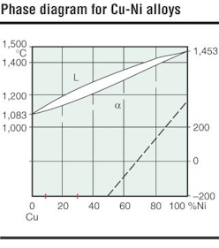 The nickel-copper phase diagram is given in Figure 1 (2). Besides pure nickel and copper, important alloys in the system are nickel-30% copper (Monel) and copper-30% nickel (Cupro-Nickel). Monel is useful in applications where contact is made with corrosive environments, e.g., acids and seawater.