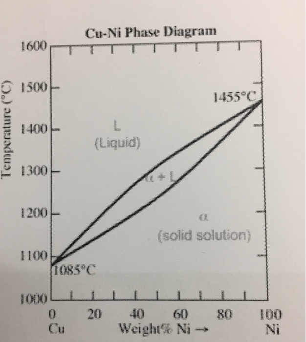 The age-hardenable copper-nickel-silicon alloys with 1.0 to 4.5% Ni and 0.2 to 0.6% Be are not dealt with here. In European standards, these alloys are assigned to ‘low-alloyed copper alloys’ (see R 13388 and relevant product standards). Figure 1. (DKI A 4049) Cu-Ni equilibrium diagram the thermal equilibrium diagram for the alloy of Copper and Nickel. In order to find what temperature 60% copper solidifies at we simply draw a vertical line from 60% copper until it hits the solidus line and at this is the point where 60% Copper has fully solidified. 0 100 10 90 20 80 30 70 40 60 50 50 60 40 70 30 80 20 90 10 100 0 900 1000 ... Shown is a partial binary phase diagram for the Copper-Nickel system with the alloy Cu-35 wt% Ni at the vertical line. At the point, a, the alloy is a liquid. Upon cooling it passes through the two-phase ( a + L) zone and then solidifies as a single phase substitutional alloy. A good interpretation of a binary phase diagram that is easy to understand and interpret is the Cu-Ni system. This diagram has three different phase regions ...