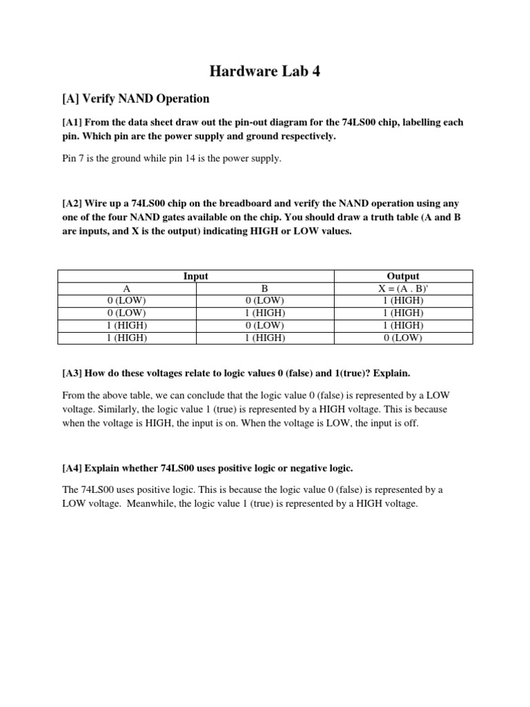 7400 - Quad Two Input NAND Gate Pin Diagram of 7400 IC. 74LS00 is a 14-pin device. The chip is available in different packages and is chosen according to the needs. The description of each pin is given below. Pin Number. Description. 1. A1-INPUT1 of GATE 1. 2.