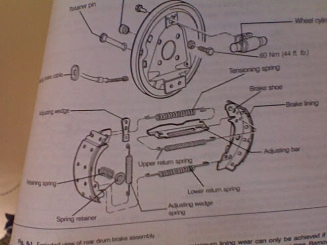 Drum Brake Diagram - How Drum Brakes Work | HowStuffWorks Drum Brake Diagram. . Now let's put it all together. The drum brake diagram below shows how all the parts of the brake work together. For more brake topics and links to related auto articles, check out the links below. . Advertisement. How Brakes Work. How Master Cylinders and Combination Valves Work. PDF 4. Parking Brake Assembly (Rear Disc Brake) ¥ Install the adjuster assembly with screw on left side. 7) Install the secondary return spring and adjusting spring. 8) Adjust the parking brakes. 9) Drive the vehicle for parking brake lining Òbreak-inÓ. (1) Drive the vehicle at about 35 km/h (22 MPH).