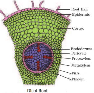 Eudicot Diagram - schematron.org Dicot Leaf. Leaf Cross Section. Plant Tissues. Monocot roots, interestingly, have their vascular bundles arranged in a ring. Dicot roots have their xylem in the center of the root and phloem outside the xylem. A carrot is an example of a dicot root. Diagram illustrating the tissue layers and their organization within monocot and dicot roots.