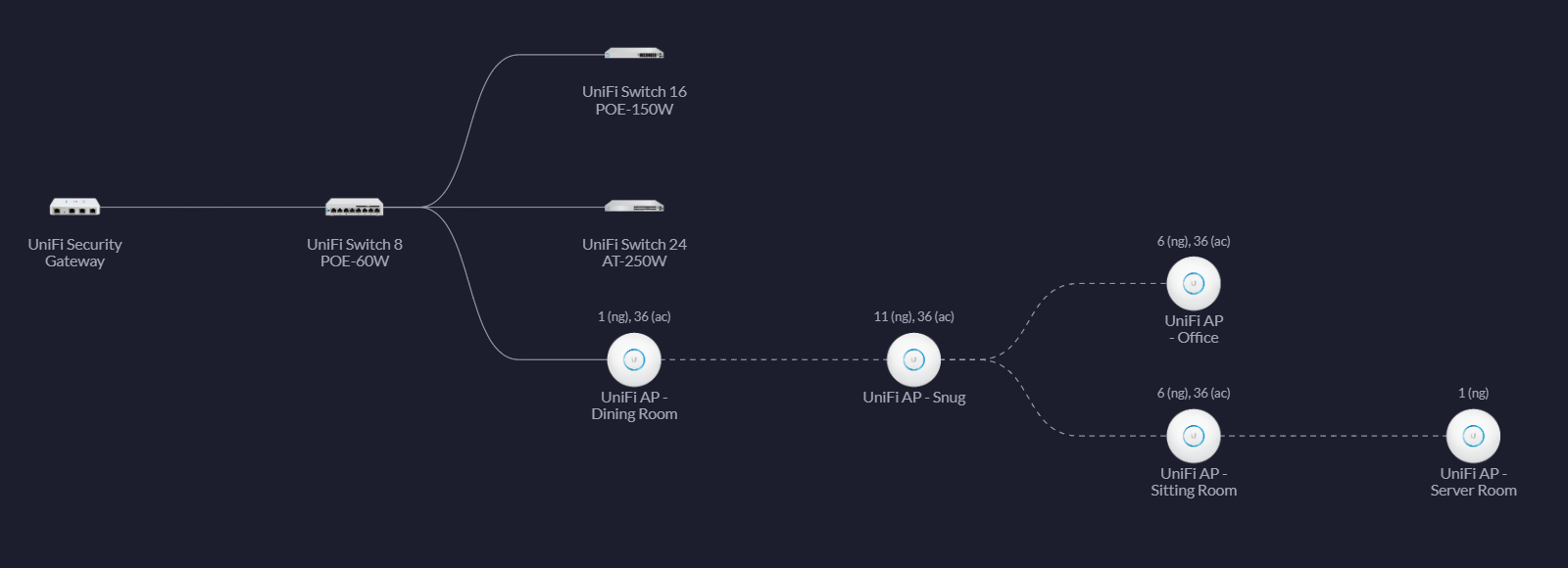 PDF 802.11n Wi-Fi Access Point - Ubiquiti Thank you for purchasing the Ubiquiti Networks® UniFi® AP. This Quick Start Guide is designed to guide you through installation and also includes warranty terms. ... Sample Network Diagram 1. To set up wireless-uplinked APs, refer to the User Guide on the website: UFiber GPON - Triple-Play Services Using VLANs - Ubiquiti ... Ubiquiti SFP/SFP+ Modules and Cables UNMS (Ubiquiti Network Management System) Table of Contents Introduction and Network Diagram Configuring the ONUs using Bulk Editing Related Articles Introduction and Network Diagram Back to Top The UFiber platform fully supports VLANs, which allows for providing Triple Play services to customers using GPON. UniFi Network Planner - Ubiquiti UniFi Network Planner Network Planner Number of stations (clients and guests) Wireless Stations Wireless throughput per user High Medium Low Wired Stations Installation Site Indoor Area Feet 2 Meters 2 POE Devices Average Power in Watts Optional *Disclaimer: Any wireless environment should have a proper survey to arrive at accurate AP counts. Wiring a home network from the ground-up with Ubiquiti Based on this diagram, signal strength is weakest around the deck area in the first picture but this is also plotted against the 5G signal which whilst faster, has less range. Here's the same map with the 2.4G spectrum instead: Devices can switch between either spectrum so the bottom line here is that there's more than enough coverage everywhere.