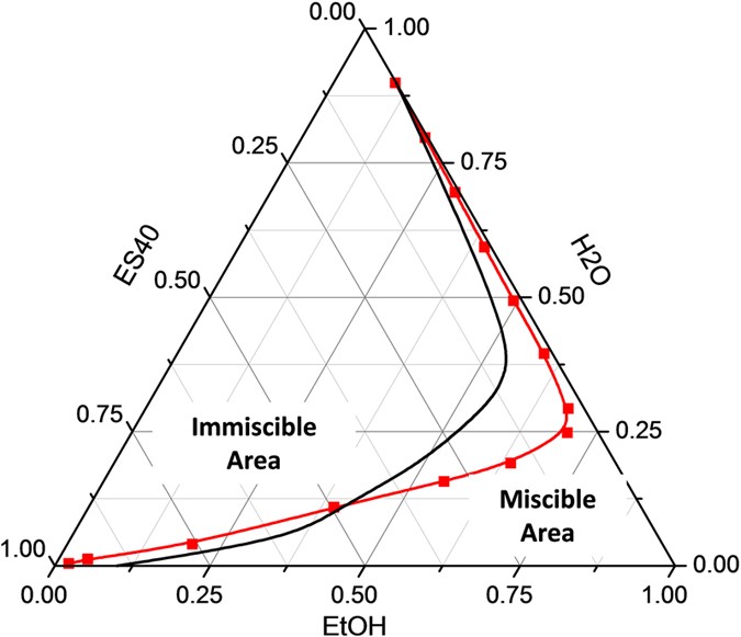 Drying paths of phase-separating solution coatings exposed to humidity ... A comparison between measured (open circles) and predicted (closed triangles) drying paths at the initial solvent content of 3 g-ethanol/g-DPHA, the vapor saturation of water of Sw = 0.86, and the air temperature of 25°C. The average compositions at different drying times were plotted on the phase diagram for every 80 s.
